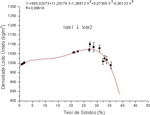 Embora a massa de lodo contida no lote 2 não tenha provindo do lote1, os lodos destes lotes são originários da mesma fonte de esgotos, receberam o mesmo tipo de tratamento, são uma mistura de descartes de lodos com idades próximas, e tem teor de sólidos fixos e voláteis muito próximos. Isto nos permite fazer um único gráfico com os pontos referentes aos lotes 1 e 2 e analisar o comportamento da densidade de uma forma indiferenciada.