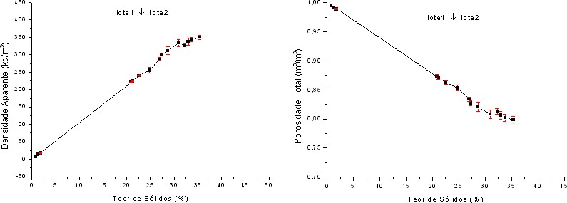 A Figura 2(a) fornece a curva da densidade aparente e a Figura 2(b) a curva da porosidade total, ambas em função do teor de sólidos, para todos os pontos experimentais do lote 1 (lodo líquido e após centrifugação) e lote 2 (lodo sólido).