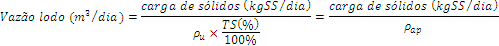 A equação (1) é bastante útil para o dimensionamento das etapas de tratamento e disposição final do lodo, quando se tem por base a vazão do lodo em diversas etapas de processamento do lodo como, por exemplo, a vazão de descarte e a vazão de disposição final. Estas vazões são normalmente relacionadas com a carga de sólidos, conforme equação (4) (SPERLING; GONÇALVES, 2001).