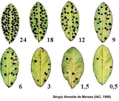 b) Escalas diagramáticas – são representações ilustradas de plantas ou partes de plantas (padrões de comparação), mostrando a área necrosada ou coberta pelos sintomas e sinais do patógeno, em diferentes níveis de severidade. Exemplos de escalas diagramáticas utilizadas para avaliar a mancha preta (Cercosporidium personatum) e a mancha castanha (Cercospora arachidicola) do amendoim são apresentados a seguir.