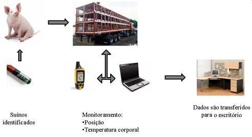 Outra aplicabilidade do sistema de GPS está no rastreamento de produção animal (ERADUS & JANSEN, 1999). Geers et al. (1997) relataram pesquisa em suínos onde cada animal foi identificado e monitorado (temperatura corporal) durante o transporte por meio do uso de transponders, circuitos ressonantes constituídos por uma antena, um capacitor e um microchip. Esses dados foram enviados a uma central via telefone celular que, a partir de um computador localizado no caminhão transportador e, trabalhando em conjunto com um GPS (Global Position System), transmitiram os dados da temperatura corporal e da trajetória percorrida para um computador localizado no escritório (Figura 9).