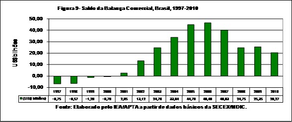 As exportações brasileiras iniciaram 1997 com US$ 52,99 bilhões e caíram nos dois anos seguintes, atingindo US$ 48,01 bilhões em 1999. Porém, a partir de 2000, as vendas externas cresceram, com notória aceleração a partir de 2002, atingindo o pico em 2008 com US$ 197,94 bilhões. Em 2009 com o cenário da crise internacional as exportações revertem a tendência diminuindo para US$ 152,99 bilhões, mas em 2010 verifica-se forte incremento das vendas externas alcançando US$ 201,92 bilhões, o maior patamar histórico (Figura 7).